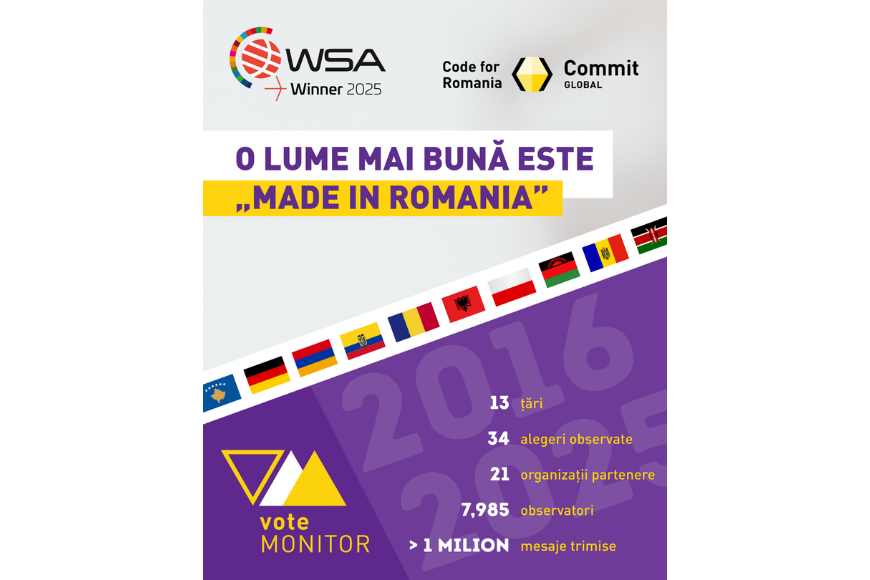 Monitorizare Vot, o soluție digitală a Code for Romania, a fost desemnată câștigătoare în cadrul World Summit Award 2025, la categoria Guvernare și Implicare Civică.