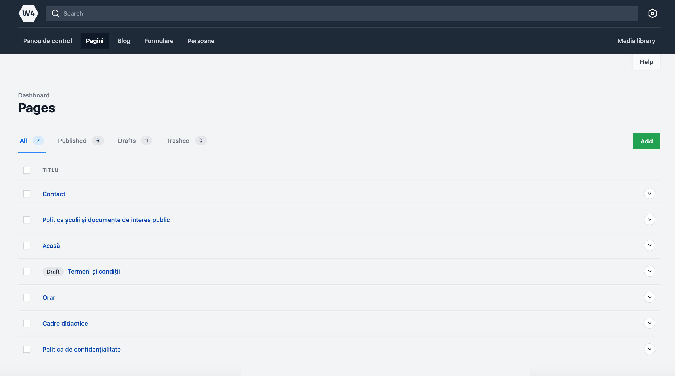 Paginile de „Termeni și condiții” și „Politică de confidențialitate”, necesare pentru orice website. Ambele pagini vin cu un text deja formulat, fiind nevoie doar de citirea lor și completarea detaliilor specifice școlii.