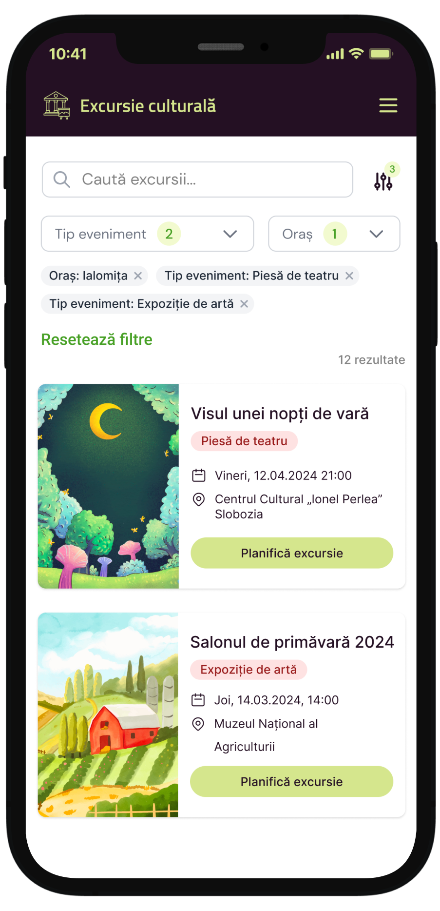 Prin intermediul soluției, profesorii pot accesa eficient (în avans și rapid) informații legate de evenimentele culturale din cele mai apropiate orașe (dată și oră, tematică, recomandare vârstă, disponibilitate locuri), opțiuni de transport (public și privat), rute de călătorie (publice), estimare cost total. De asemenea, pot face rezervări și pot gestiona digital documentele necesare organizării excursiei (ex: acordul părinților, aprobare instituție învățământ, regulament și norme de protecție). Elevii pot confirma participarea sau pot sugera o anumită excursie.