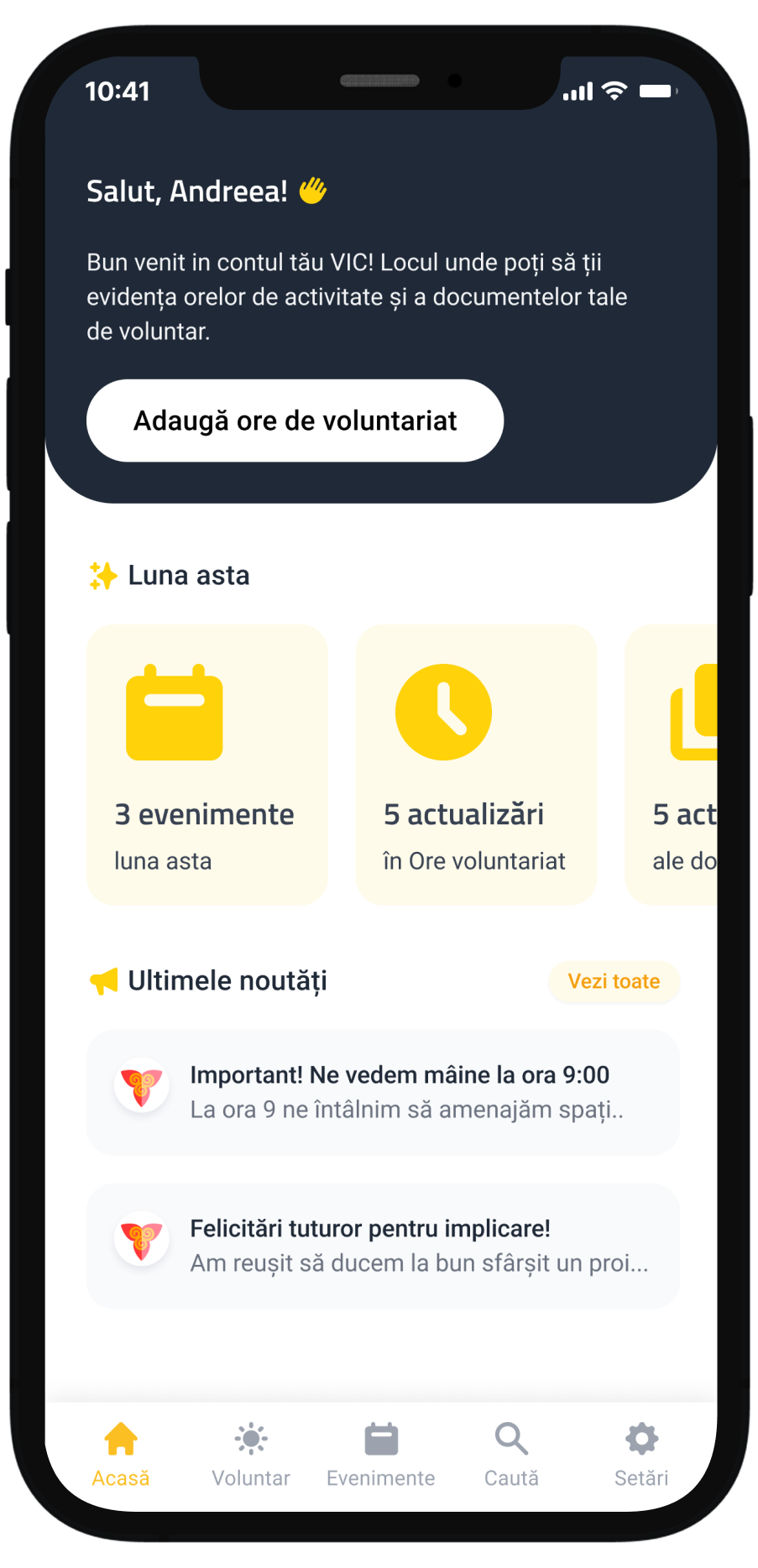 Eficientizarea gestionării comunităților de voluntari (contracte, ore lucrate, adeverințe, informații și istoric voluntar);