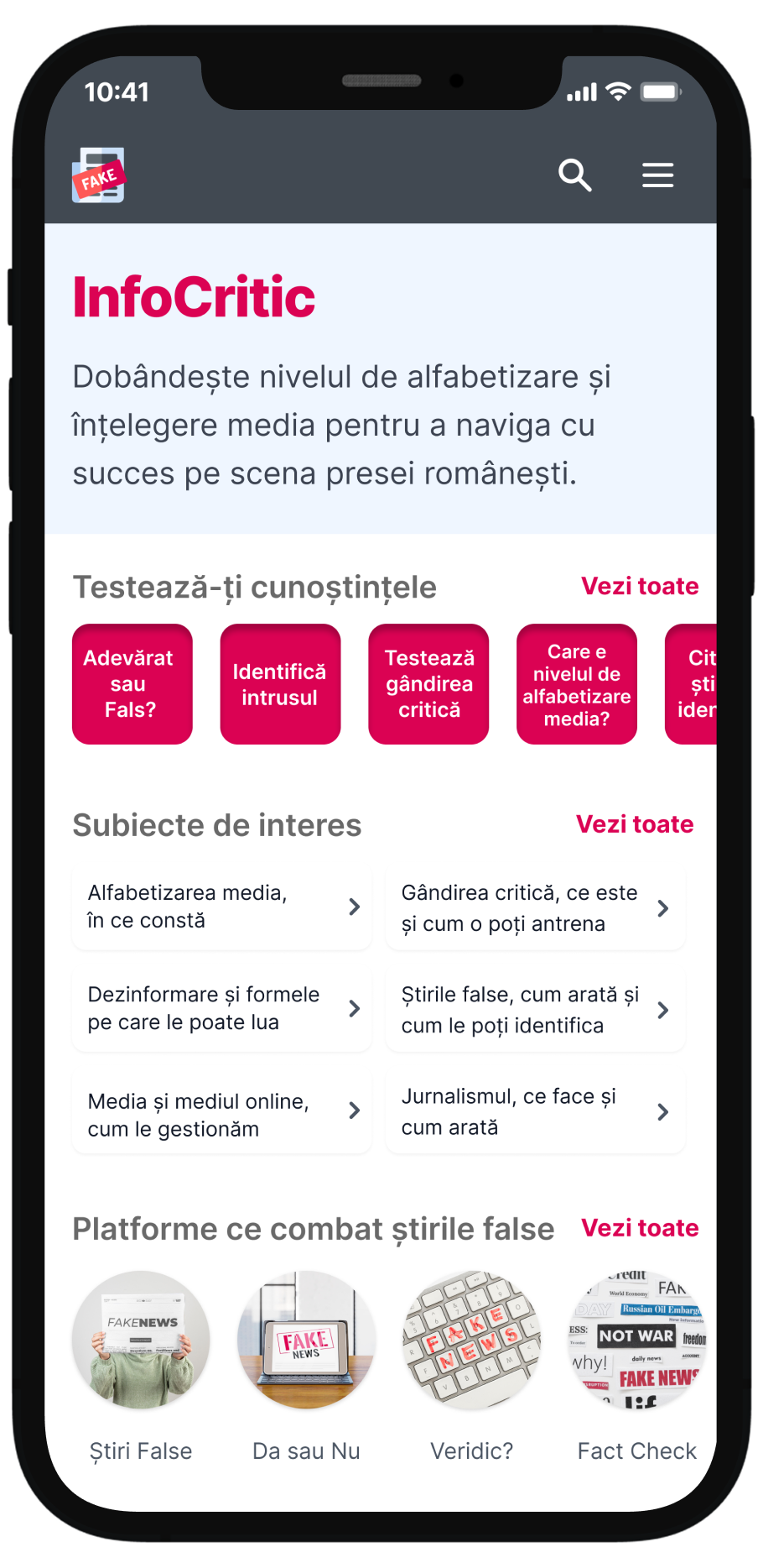 Pentru a oferi utilizatorului și acces la instrumentele deja existente dedicate identificării dezinformării, modulul de fact-checking (verificare de fapte) oferă o listă verificată și validată a platformelor românești sau internaționale dedicate identificării și combaterii știrilor false.