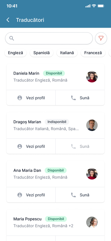Transparență în selecția experților, cu informații despre disponibilitate, servicii și tarife.