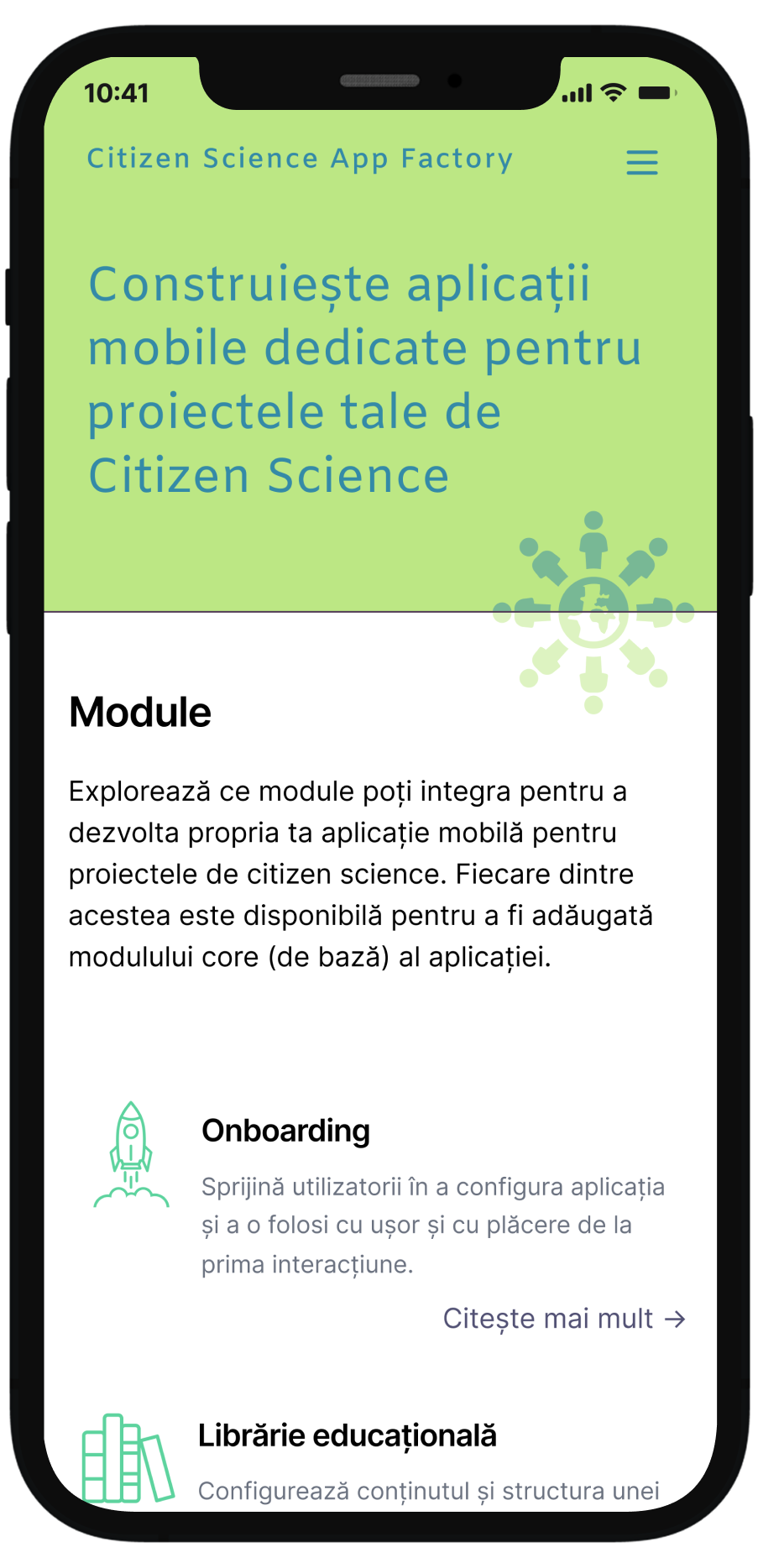 Module precum onboarding (creare cont și configurare aplicație), librărie de conținut educațional, sistem de documentare prim imagini, folosirea de geolocație, cartare de puncte și areale de colectare de date, crearea de challenges, notificări, moderare conținut, vor permite construirea unei aplicații adaptate pentru fiecare caz. Evitând situația unei construiri de la zero a unei astfel de soluții, codul open source va permite un mod mult mai eficient de a dezvolta o asemenea aplicație.