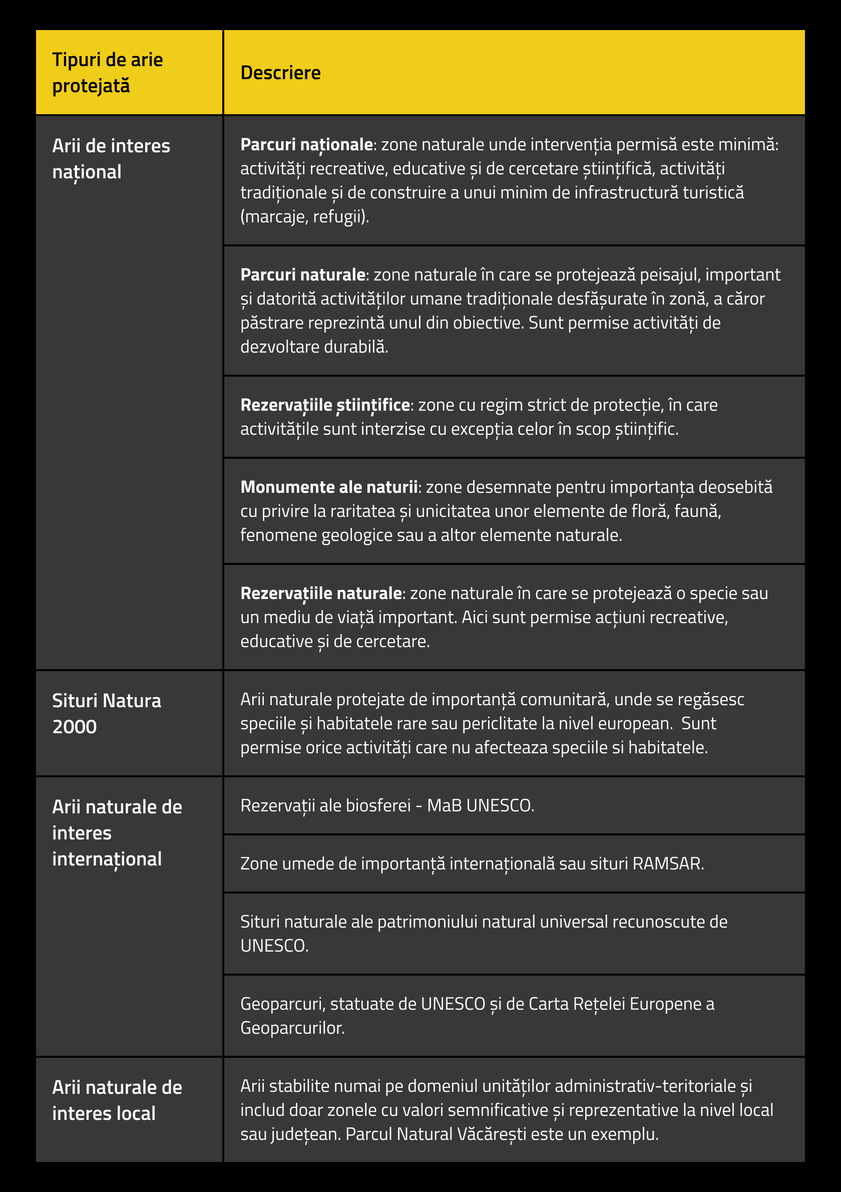 Complementar cu informațiile geografice despre specii și habitate este foarte necesar ca cetățenii să aibă acces la informații legate de limitele ariilor protejate, planurile de management din aceste arii și restricțiile din fiecare zonă. Deținerea de proprietăți în arii protejate implică restricții și posibil și niște instrumente financiare de compensare pentru acele restricții. Dar mulți cetățeni nu știu dacă proprietățile lor se află în arii protejate și nu pot vizualiza limitele ariilor protejate. În același timp este necesar să se poată vizualiza un istoric al modificărilor limitelor acestora ca să se poată analiza posibile abuzuri din trecut sau alte informații cu caracter dinamic. În momentul redactării acestui raport (august 2024) datele GIS despre zonare sau distribuția speciilor sunt publicate pe site-ul Ministerului Mediului în fișiere descărcabile. Însă deschiderea și citirea acestora necesită software specializat. Date despre zonarea ariilor protejate se mai găsesc, neintuitiv pentru cetățeni, și în aplicația Inspectorul Pădurilor, aplicație dedicată raportării transporturilor ilegale de lemn.