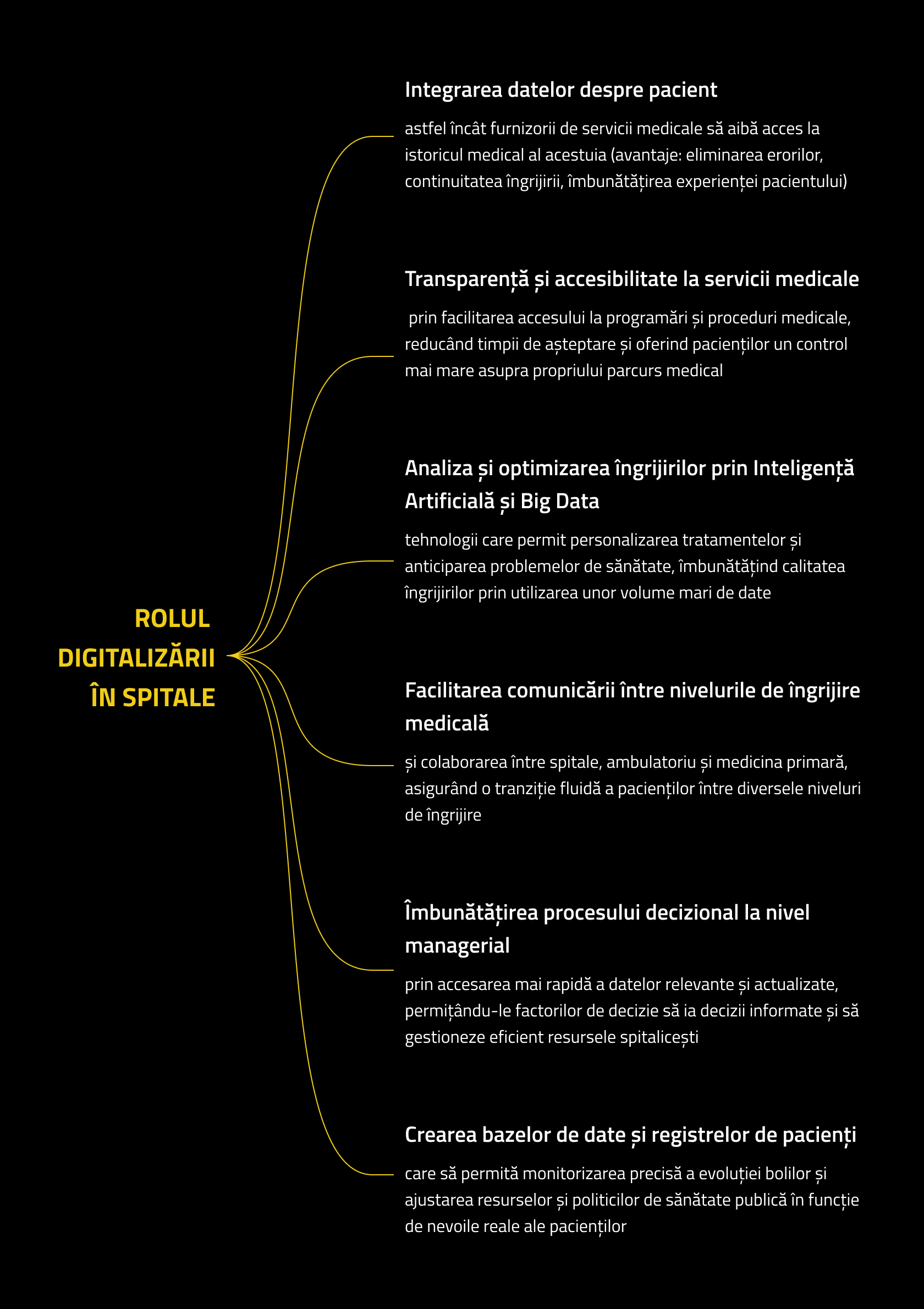 Rolul tehnologiei sau al digitalizării în sistemul de sănătate depinde de modul în care utilizatorii finali, precum personalul medical, managerii de spitale, medicii, pacienții și factorii decizionali beneficiază de implementarea acesteia. Dacă privim digitalizarea la nivelul unui spital, putem identifica câteva dimensiuni esențiale care contribuie la o înțelegere mai cuprinzătoare a îmbunătățirilor aduse întregului sistem de sănătate. Diagrama de mai jos sintetizează principalele aspecte evidențiate de experții intervievați în cadrul cercetării noastre.
