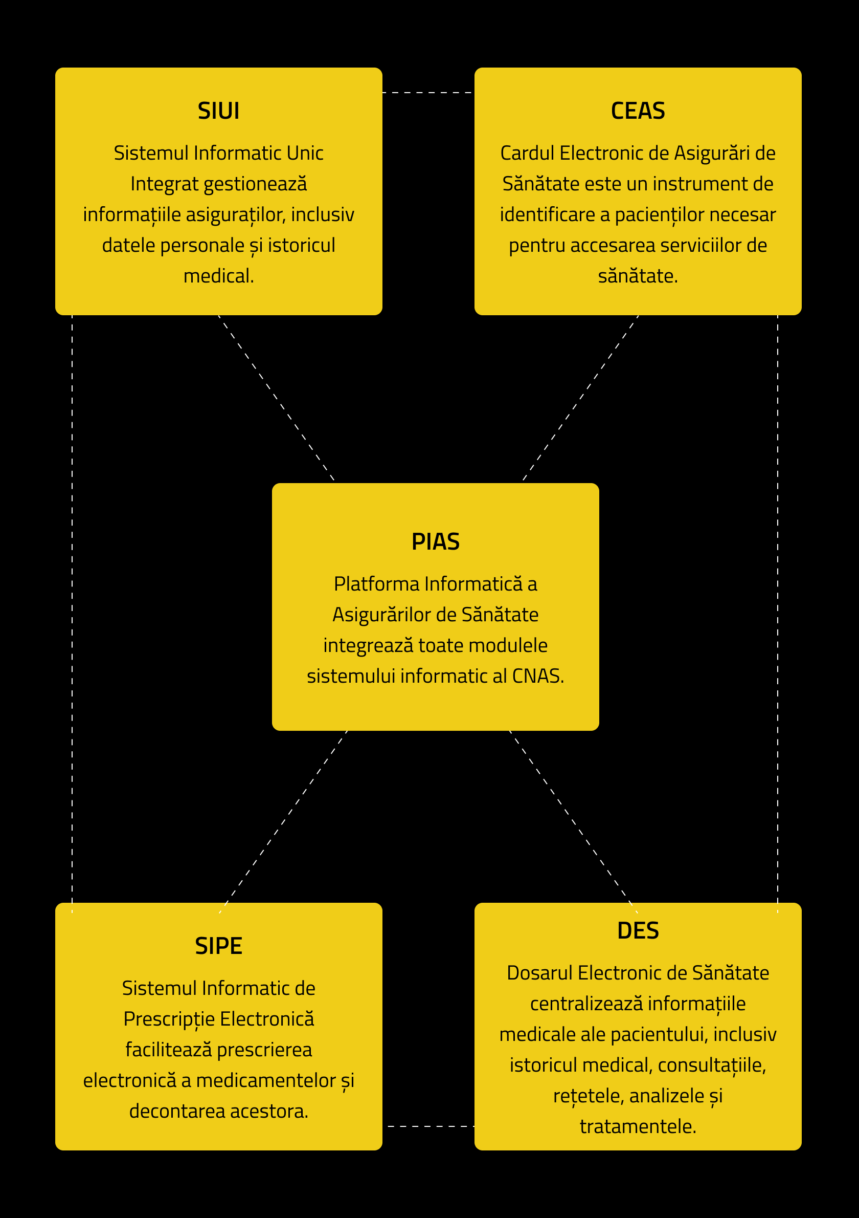 În România, digitalizarea sistemului de sănătate avansează cu dificultate, fiind mult sub media Uniunii Europene, ceea ce reprezintă un risc pentru realizarea țintelor UE 2030, cu toate că țara beneficiază de cea mai bună infrastructură de fibră optică din UE și de un număr mare de specialiști licențiați în IT, conform unui raport al Comisiei Europene. Informatizarea sistemului de sănătate a necesitat o investiție de 173 de milioane de euro (fără TVA), și a inclus mai multe componente, cum ar fi sistemul informatic unic integrat (SIUI), rețeta electronică, cardul electronic de sănătate și dosarul electronic de sănătate (ilustrate în diagrama de mai jos). În prezent, niciuna dintre aceste componente nu funcționează optim, îngreunând activitatea medicilor. În februarie 2024, Ministerul Sănătății a anunțat o investiție de 100 de milioane de euro în sistemul informatic al CNAS pentru a îmbunătăți securitatea cibernetică, digitalizarea instituției și optimizarea noii Platforme Informatice pentru Asigurările de Sănătate (PIAS). Acest anunț a fost făcut la scurt timp după ce mai multe spitale au fost victimele unor atacuri cibernetice.