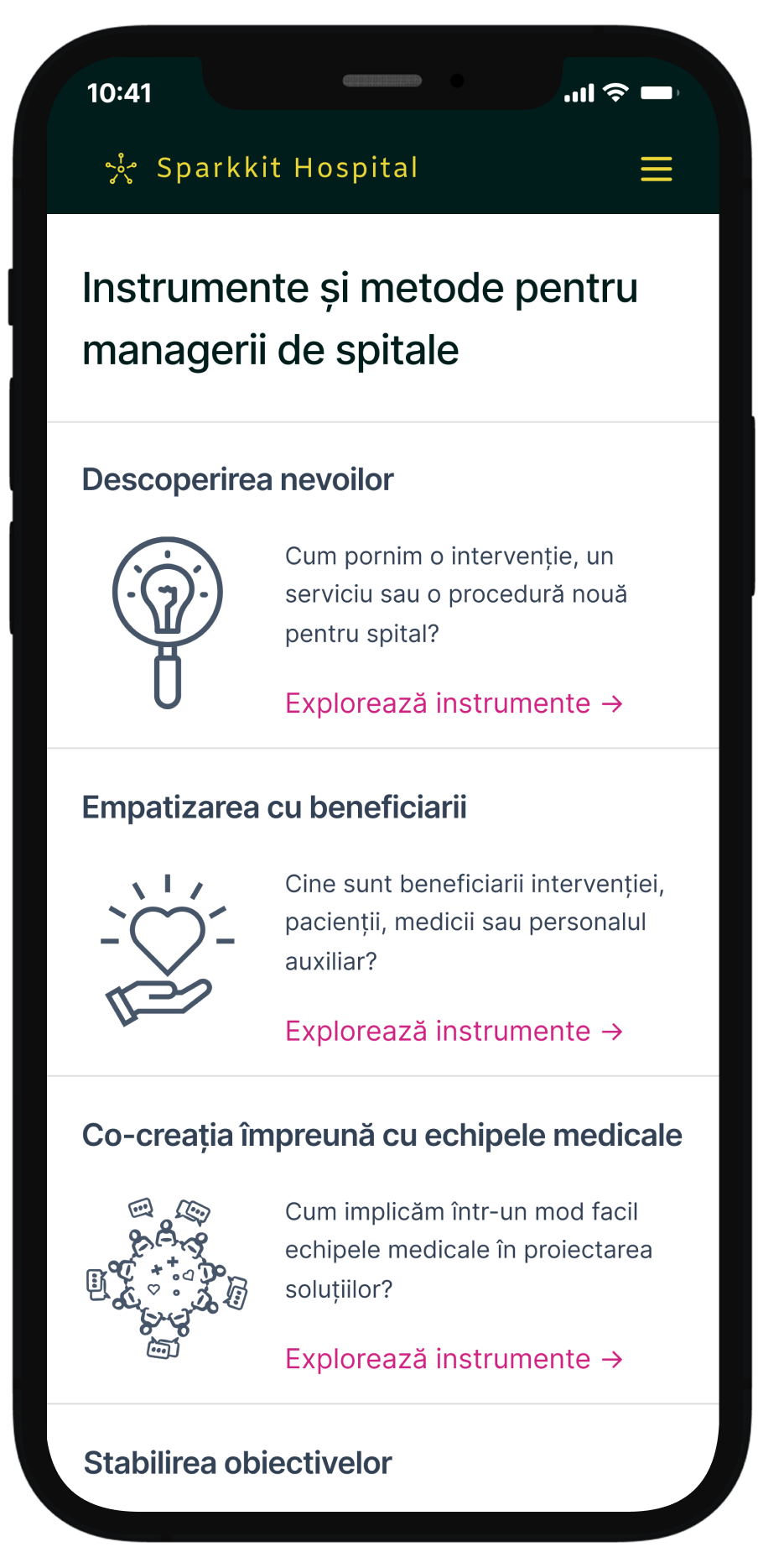Managerii de spital și echipele acestora vor fi ghidați în procesul de înțelegere al problemelor pe care trebuie să le abordeze, al contextului în care acestea apar și vor învăța cum să empatizeze cu pacienții și personalul medical. Vor putea cartografia, prin instrumente specifice, contextul instituțional în care desfășoară serviciile, inclusiv resursele disponibile, motivația echipei, stakeholderii și posibilele riscuri asociate. De asemenea, platforma le va permite să organizeze întâlniri de brainstorming și sesiuni de co-creare cu echipele lor, facilitând luarea deciziilor privind reinventarea spitalului pentru a-l face mai eficient și funcțional. Managerii vor putea, de asemenea, să elaboreze un plan de intervenție bine structurat, să integreze dovezile științifice în abordările lor, și să articuleze bugetele și nevoile financiare.